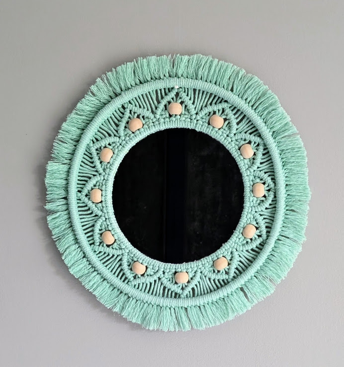 Miroir double cercle réalisé avec du coton vert d’eau de 3mm et perles en bois